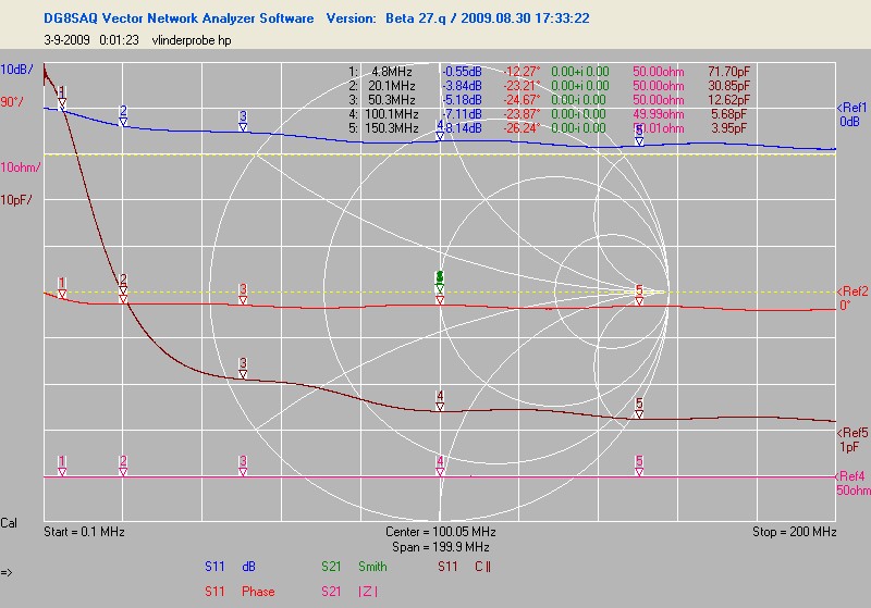 Na hercalibratie van de vna (er is een firmware en software update geweest (nu ook polar en radar plots)) waren de uitkomsten wat logischer. Ik heb een paar probes nog eens gedaan. Dat voelsprietje van HP, de gewone probe die bij de hp zat en een universele probe die ik bij de 150MHz tek kreeg.