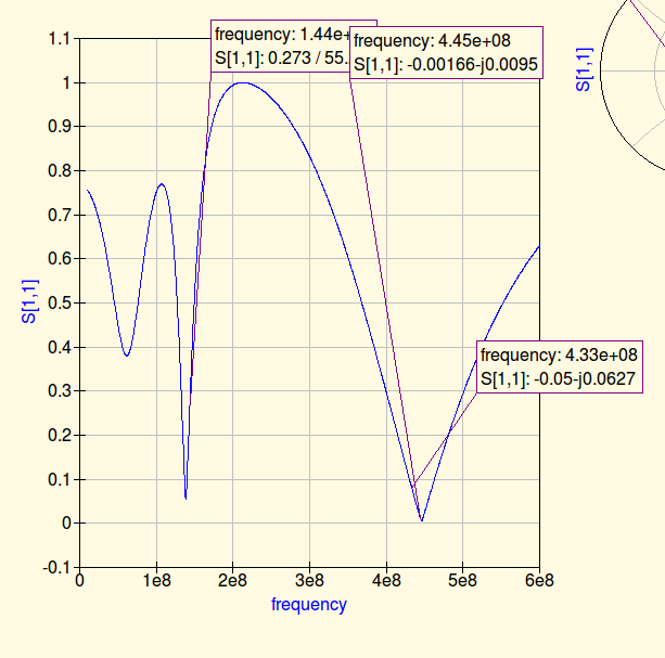 Als ik een lumped model maak van de antenne dan heb ik met 7 pF op 145 en 440 een Reflectie coöficient van 0,05 en 0 .