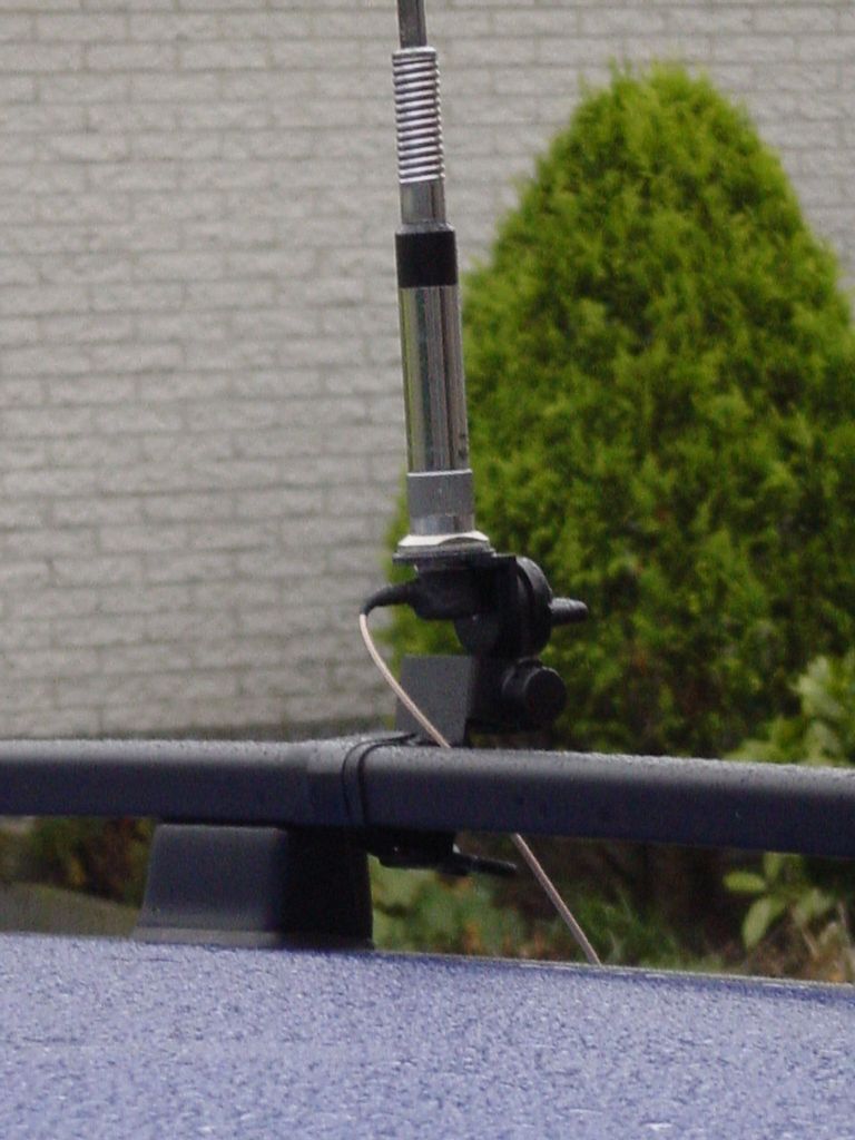 Deze constructie staat volledig elektrisch geisoleerd op de dakrails en indien je hier een HF antenne op wilt zetten moet je dus wel een goede RF-ground aan het geheel maken. Je zou dat kunnen doen door een voldoende dik stuk litze aan het draadeinde te bevestigen en dat tussen het deurrubber aan een van de bouten van het portierscharnier te verbinden. En als tweede waarschuwing geld dat de antenne die nu hierop gebruikt word een zogenaamde "Radialless" antenne is die geen tegencapaciteit benodigd.