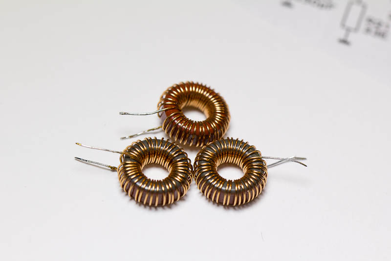De rode ringkernen (T37-2) moeten met 38 windingen worden gewikkeld. Dat zijn er meer dan de bovenstaande gele, dus moet je nu ca. 0,25mm gelakt koperdraad gebruiken. Ik heb 0,28mm gebruikt, dat maakt niet zoveel uit.