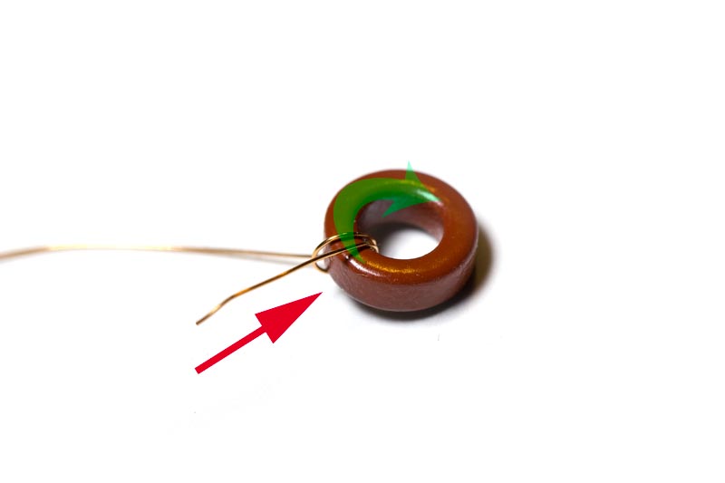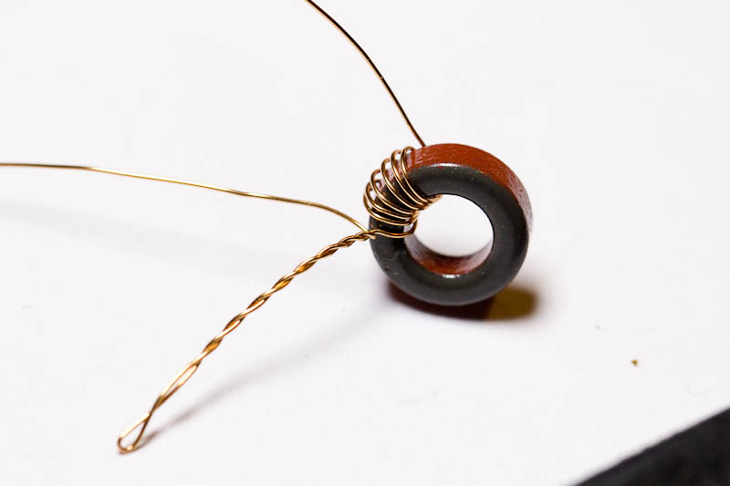 Het ringkerntje van de onderkant bekeken. Na 6 windingen vouw je de draad even om en draait die in elkaar.