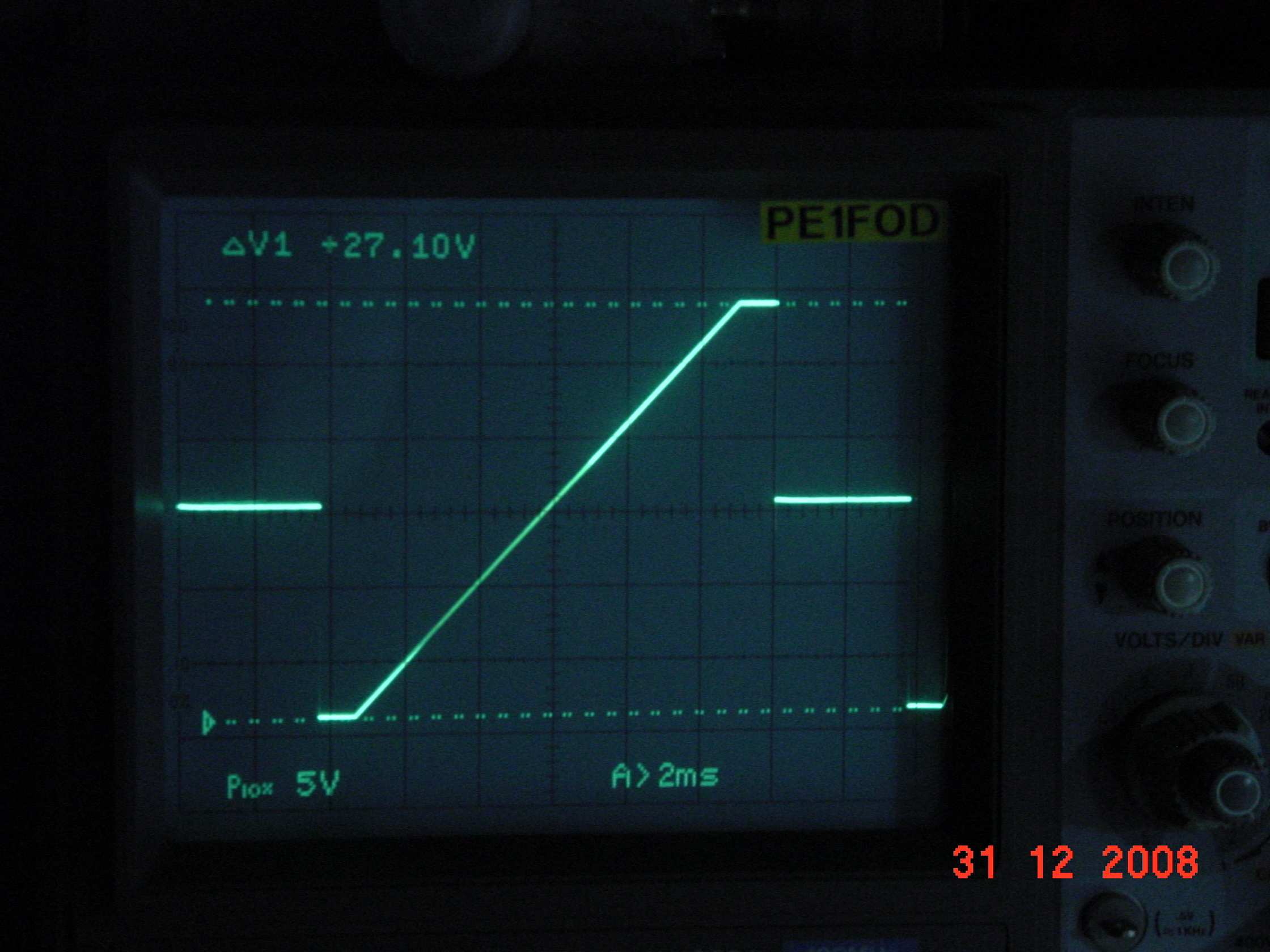 Sweep time (P2) stel je zodanig in, dat het beeld op de scope niet meer hinderlijk knippert. Te snel zorgt ervoor, dat de IF het niet meer bijhoudt, dus kies gewoon een comfortabele waarde (tegen de klok in is sneller).