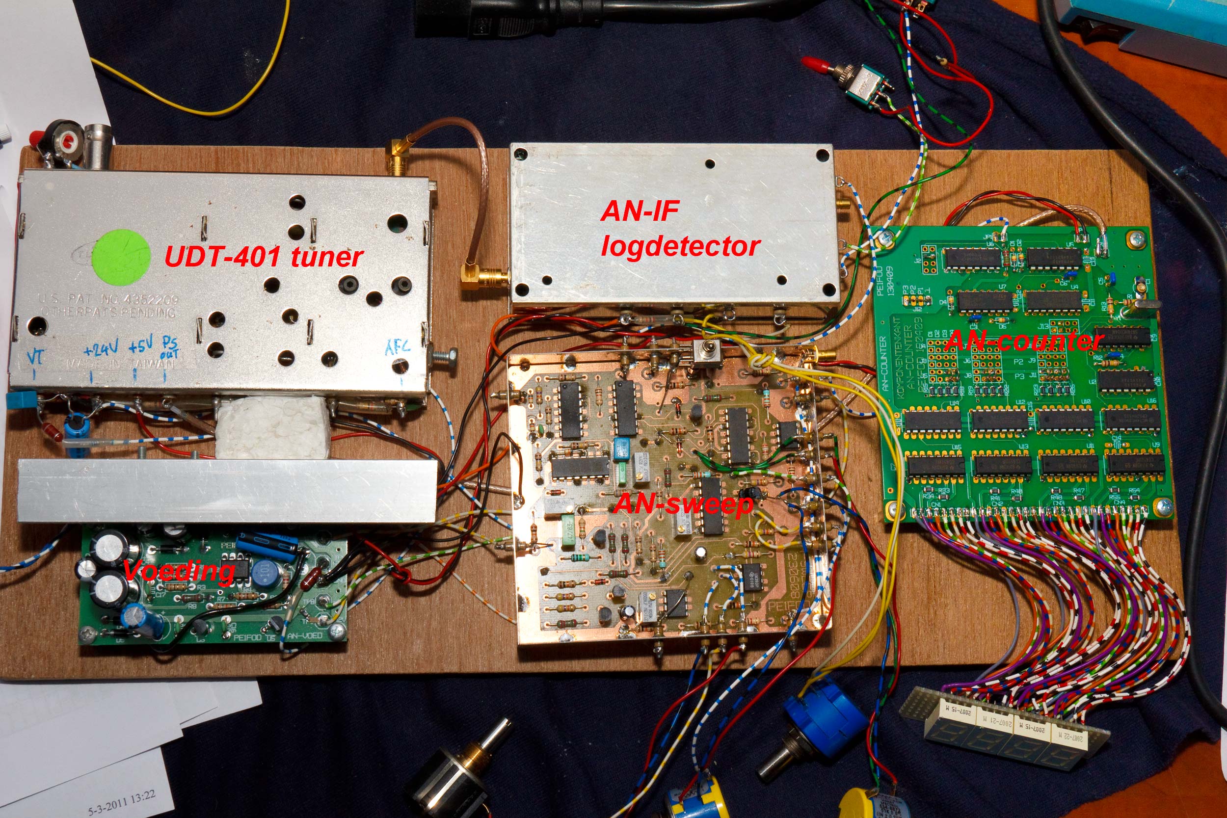 AFC stel je in op ongeveer 3 á 4 V. Gebruik gerust een spanningsdeler met twee weerstanden, zoals nu, maar de spanning moet iets omlaag, dus heb ik een potmeter met de loper aangesloten op dit AFC punt, andere kant aan massa en weer de andere kant op 5V. Nadat de AFC op ca. 3 tot 4V staat, regel je verder af met de stelschroef. Dit beinvloed ook de relatie tussen de center frequentie en wat de counter weergeeft. Wijkt de counter dus af, regel dan de AFC.