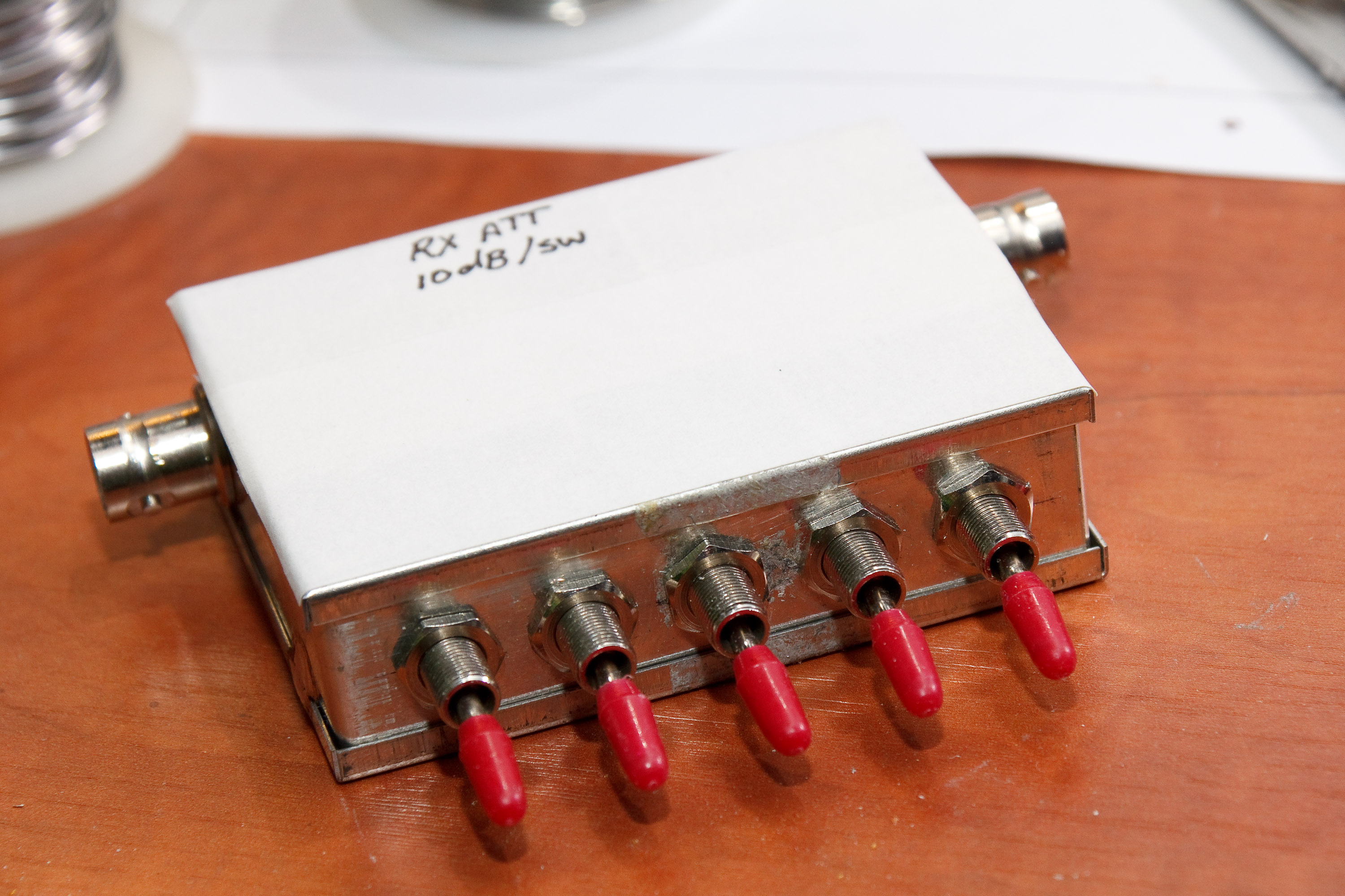 Er worden dubbele wisselschakelaars ("dubbel-om") gebruikt. Niet optimaal voor 50 Ohm, maar het is maar voor kleine signaaltjes of ontvangst. In stand "off" wordt er gewoon een doorverbinding gemaakt en wordt het weerstandsnetwerk gepasseerd. In stand "on" wordt het weerstandsnetwerk ingevoegd. Per schakelaar zijn dat drie weerstanden en met deze waarden (68 en 100 Ohm) levert dat een deming op van ca. 10dB. Dat kun je herhalen met nóg zo'n schakelaar en netwerkje. Je kunt dan 20dB demping verzorgen. Etc. voor 30, 40 of 50dB. Ik ben doorgegaan tot 5 schakelingen. Belangrijk is, dat de schakelingen elkaar onderling niet "zien". Je zult dus moeten gaan werken met schotjes ter afscherming. De massa moet zeer goed zijn en geschikt voor RF signalen.
