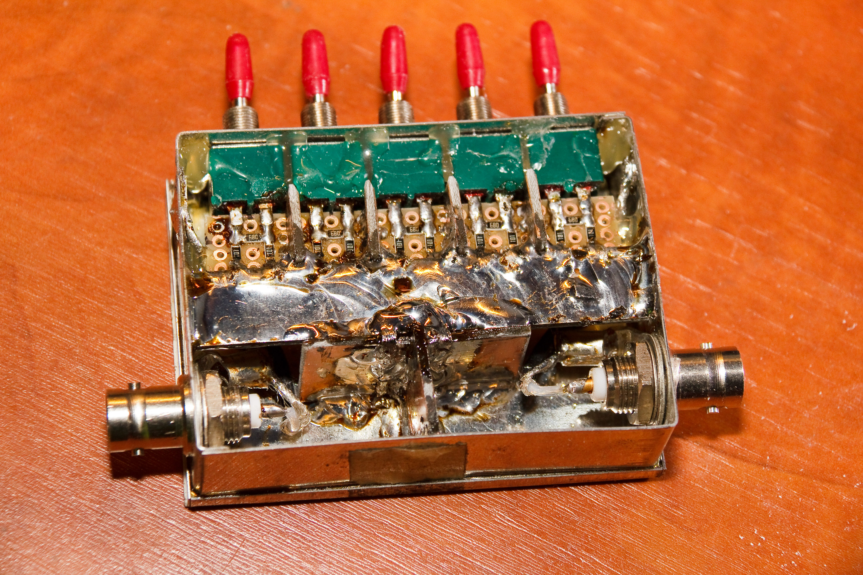 Bovenstaand voorbeeld was niet voldoende (ging goed tot 20dB en niet meer). Het moet veel demping opvangen, dus werk met een plaat (stuk koper printplaat ofzo). Dit draadje werkt bovendien als een soort spoel. Ook missen de schotjes tussen de weerstandsnetwerkjes nog. Maar gelukkig had ik ruimte overgelaten: